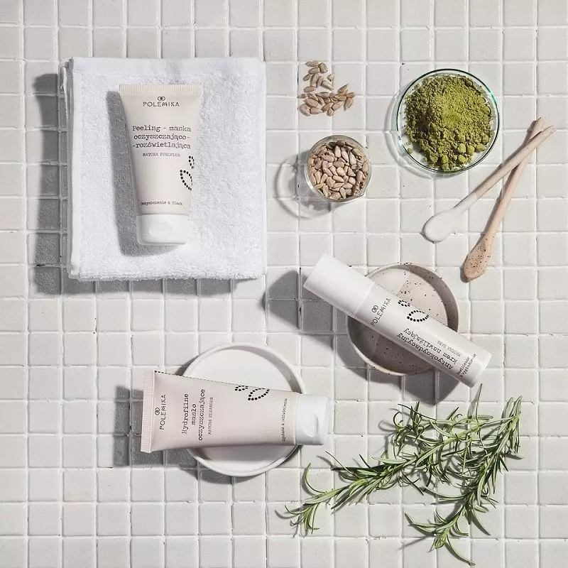 I tu na pomoc przychodzą kosmetyki Polemika. Dostarczają skórze witamin, antyoksydantów i mikroelementów. Wzmacnia jej barierę ochronną, wymiatają wolne rodniki. Wyjątkowe właściwości kosmetyczne zielonej herbaty Matcha sprawiają, że dotlenia i pobudza regenerację skóry. Detoksykuje, nawilża, odmładza oraz matuje i reguluje wydzielanie sebum. Wybierając kosmetyki z Matchą, trzeba pamiętać, że najważniejsza jest regularność stosowania. Rytuał należy rozpocząć od dokładnego oczyszczenia twarzy i szyi Hydrofilne masło oczyszczające do twarzy z serii Matcha Cleanser, który zmyje z niej zanieczyszczenia, które gromadzą się nawet podczas snu. Kolejnym krokiem w codziennej pielęgnacji jest peeling-maska. Peeling – maska 2 w 1 z serii Matcha Purifier. Efekt oczyszczenia i rozświetlenia widzimy już chwilę po aplikacji ze względu na szybkie działanie ekstraktu z kawioru roślinnego, papainy oraz drobinek naturalnej celulozy, które delikatnie rozprowadzone, złuszczają martwe komórki naskórka. Dopiero wtedy możemy nakładać produkty bogate w składniki odżywcze. Wybieramy antyoksydacyjny krem nawilżający do twarzy, który skutecznie zregeneruje naszą skórę.