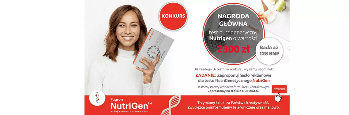 Mamy dla Państwa fantastyczny konkurs z Partnerem naszej Konferencji marką Nutrigen. Każdy z Uczestników konkursu otrzyma upominek, a nagroda główna to test nutrigenetyczny o wartości 2 300 zł netto.