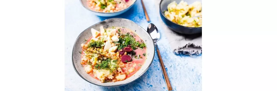 Zupa botwinkowa z ziemniakami i smażoną cebulą. fot. Rapso