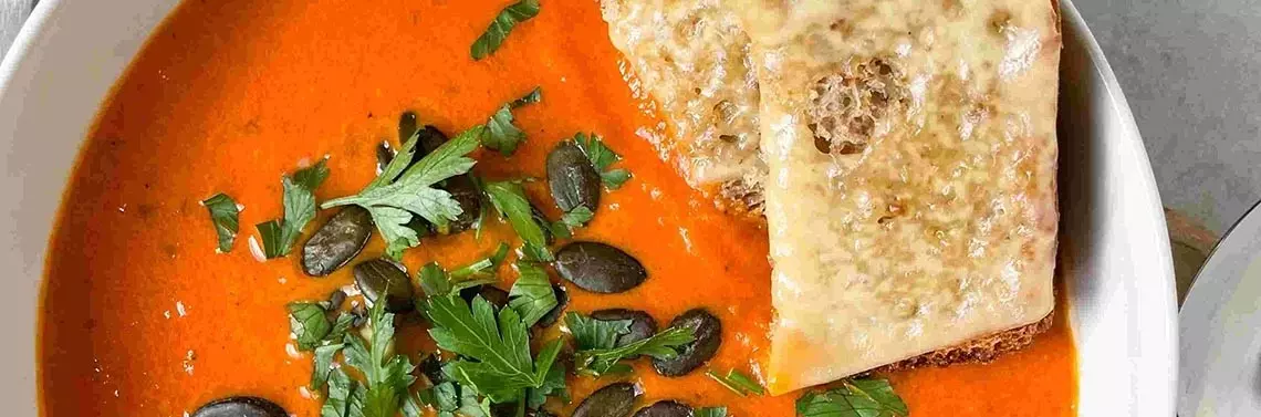 Do żaroodpornego naczynia włóż pomidory, obrany czosnek, cebulę pokrojoną w półplasterki, polej olejem, posyp solą, pieprzem, tymiankiem, majerankiem, dokładnie wymieszaj i włóż naczynie do piekarnika nagrzanego do 200 stopni na 30 minut. 5 minut przed końcem pieczenia włóż do piekarnika pieczywo z plasterkami sera. Po tym czasie przełóż warzywa do garnka i zblenduj na krem. Zupę posyp posiekaną natką pietruszki i podawaj z grzankami z serem.