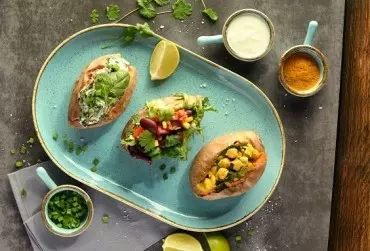 Pieczone ziemniaki z ogniska to klasyk, który wszyscy znamy. W Anglii zaś słynne ziemniaczane danie kryje się pod nazwą „jacket potato” czyli pieczony ziemniak w mundurku z farszem. Idąc dalej tym tropem zamieniamy ziemniaka na jego słodszego i zdrowszego kuzyna - batata. W smaku przypomina skrzyżowanie ziemniaka z marchewką, a bogactwem mikroelementów i witamin nie ma sobie równych. Przedstawiamy batata w trzech odsłonach, każdy przepis inspirowany jest innym kierunkiem świata. Indie, Meksyk czy Grecja, który kraj zagości na Twoim stole?