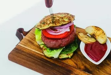 Burger wołowy na plackach z cukinii z keczupem z jabłek