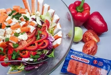 SURIMI to jeden z najpopularniejszych produktów rybnych na świecie. Stworzony został w Japonii, a jego nazwa oznacza „uformowane ryby”, w smaku zaś przypominać ma mięso kraba. Do jego produkcji wykorzystuje się najlepszej jakości gatunki ryb morskich - dorsz, mintaj, miruna. Nowe Paluszki Surimi od PESCA NORD to składnik wielu potraw, które można przygotowywać na co dzień, jak i na imprezy urodzinowe, prywatki czy z okazji świętowania nocy sylwestrowej. Jako samodzielną przekąskę możemy serwować ją w towarzystwie sałatki, makaronu, ciasta francuskiego czy ostrego dipu. Najwyższa jakość produktu gwarantuje, iż Paluszki Surimi od PESCA NORD podane w dowolnej postaci zawsze będą smakować wyśmienicie. Poniżej propozycje dwóch prostych sałatek od PESCA NORD: