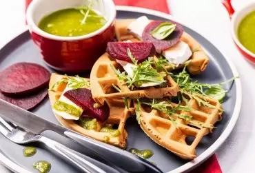 Gofry w wydaniu deserowym znamy i lubimy chyba wszyscy. A gdyby tak połączyć migdałową słodycz ciasta z wytrawnym smakiem pesto i podać w towarzystwie sałaty, kawałeczków buraka i sera? Podpowiadamy - będzie pysznie, będzie smacznie, będzie zdrowo.