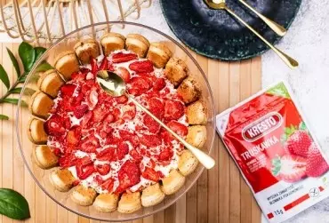 Tiramisu to deser o włoskim rodowodzie. Warstwa nasączonego w kawie biszkoptu oraz pysznego kremu z mascarpone tworzy pyszną, rozpływającą się w ustach kompozycję. Dzisiaj proponujemy wersję urozmaiconą o pyszne liofilizowane truskawki, które nie tylko dodają smaku, ale nadają całości wykwintnej chrupkości.