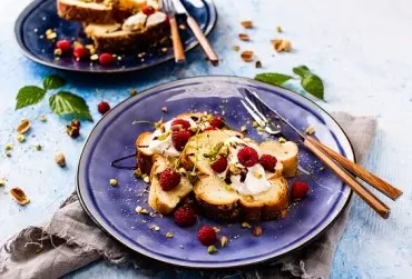 Chałka z kozim twarożkiem, malinami i pistacjami to klasyka smaku w finezyjnym wydaniu. Harmonijnie dobrane składniki tworzą na talerzu niepowtarzalną kompozycję smakową, a dodatkowo stanowią mocny akcent kulinarnej aranżacji. To doskonały sposób na prosty i szybki deser, który można podać zgodnie z przepisem lub urozmaicić o kolejne dodatki wedle swojego uznania.
