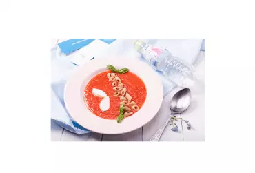 Zupa krem z pomidorów z makaronem i kleksem jogurtu